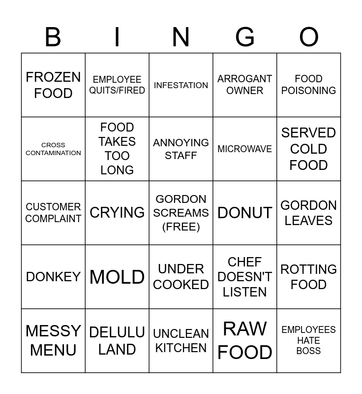 This bingo card has a free space and 24 words: MOLD, DELULU LAND, ANNOYING STAFF, MESSY MENU, FOOD POISONING, FROZEN FOOD, CROSS CONTAMINATION, EMPLOYEE QUITS/FIRED, DONUT, UNDER COOKED, MICROWAVE, CUSTOMER COMPLAINT, CHEF DOESN'T LISTEN, ROTTING FOOD, FOOD TAKES TOO LONG, RAW FOOD, GORDON LEAVES, INFESTATION, SERVED COLD FOOD, CRYING, EMPLOYEES HATE BOSS, DONKEY, ARROGANT OWNER and UNCLEAN KITCHEN.