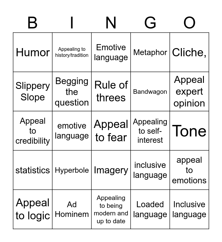 This bingo card has 44 words: Free!, Appeal to fear, Statistics, Appeal to logic, Anecdotes, Loaded language, Emotive language, Appeal to hip pocket nerve (finance), Cliche,, Ad Hominem, Metaphor, Appealing to self-interest, Imagery, Hyperbole, Appealing to group loyalty or belonging,, Appealing to being modern and up to date, Inclusive/exclusive language, Appeal to credibility, Undermining credibility, Appeal expert opinion, Appealing to history/tradition, Rhetorical question, Appeal to freedom, Humor, Connotations, Tone, Rhetorical questions, High modality words, inclusive language, statistics, appeal to logic, appeal to emotions, appeal to trust, repetition, emotive language, Selection & Omission, Generalization, Inclusive language, Rule of threes, Slippery Slope, Bandwagon, Strawman, Begging the question and Appeal to nature.