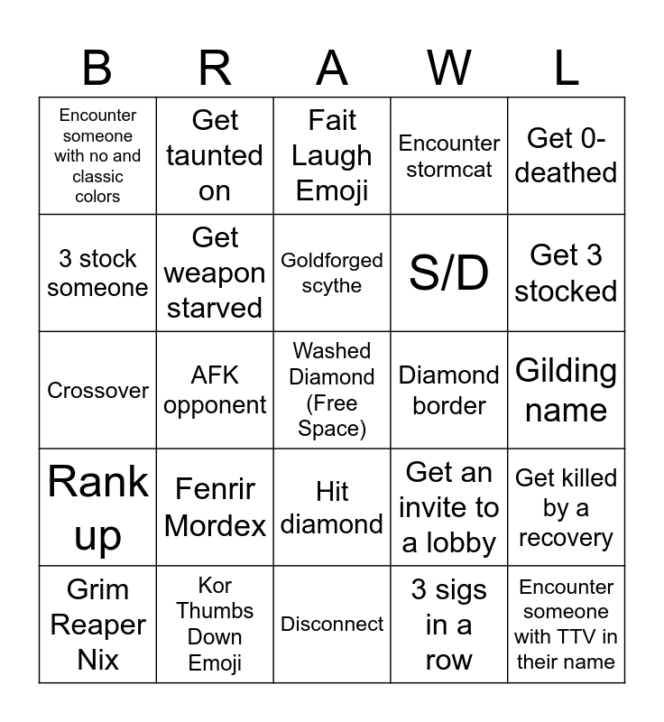 This bingo card has a free space and 24 words: Fenrir Mordex, Kor Thumbs Down Emoji, Goldforged scythe, Grim Reaper Nix, Get 0-deathed, Encounter someone with no and classic colors, 3 stock someone, Get taunted on, Diamond border, Hit diamond, S/D, Crossover, Get an invite to a lobby, Get killed by a recovery, Get weapon starved, 3 sigs in a row, Gilding name, Fait Laugh Emoji, Get 3 stocked, AFK opponent, Encounter someone with TTV in their name, Rank up, Encounter stormcat and Disconnect.