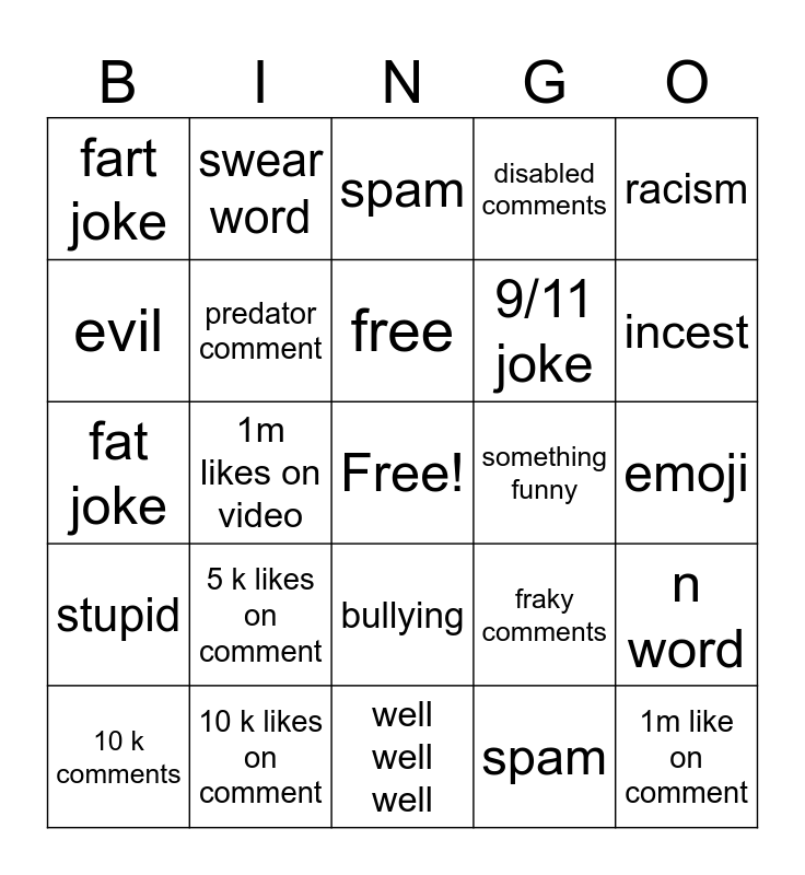 This bingo card has a free space and 24 words: 5 k likes on comment, 10 k likes on comment, free, 10 k comments, racism, fart joke, evil, swear word, something funny, bullying, 9/11 joke, fat joke, fraky comments, n word, predator comment, spam, emoji, spam, incest, 1m likes on video, 1m like on comment, stupid, disabled comments and well well well.