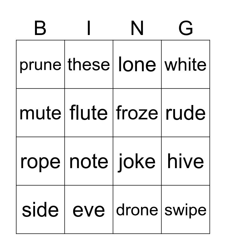 This bingo card has 25 words: Free!, June, rude, flute, mute, prune, flute, these, eve, spoke, rope, joke, globe, woke, froze, stroke, drone, lone, note, hive, side, slime, swipe, white and pride.