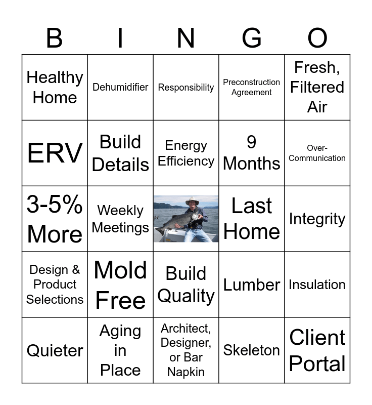 This bingo card has a free space and 24 words: Mold Free, Aging in Place, Energy Efficiency, Quieter, Fresh, Filtered Air, Healthy Home, ERV, Dehumidifier, Last Home, Build Quality, 9 Months, 3-5% More, Lumber, Insulation, Build Details, Skeleton, Integrity, Responsibility, Over-Communication, Weekly Meetings, Client Portal, Design & Product Selections, Preconstruction Agreement and Architect, Designer, or Bar Napkin.