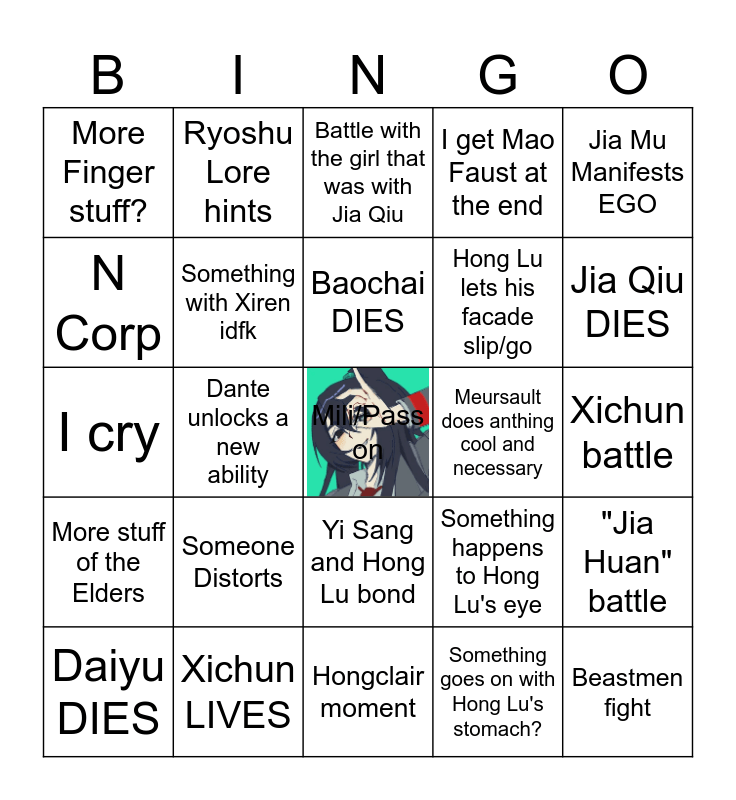 This bingo card has a free space and 24 words: Someone Distorts, Xichun LIVES, Baochai DIES, Daiyu DIES, Jia Mu Manifests EGO, More Finger stuff?, N Corp, Ryoshu Lore hints, Meursault does anthing cool and necessary, Yi Sang and Hong Lu bond, Hong Lu lets his facade slip/go, I cry, Something happens to Hong Lu's eye, "Jia Huan" battle, Something with Xiren idfk, Something goes on with Hong Lu's stomach?, Xichun battle, Battle with the girl that was with Jia Qiu, Jia Qiu DIES, Dante unlocks a new ability, Beastmen fight, More stuff of the Elders, I get Mao Faust at the end and Hongclair moment.