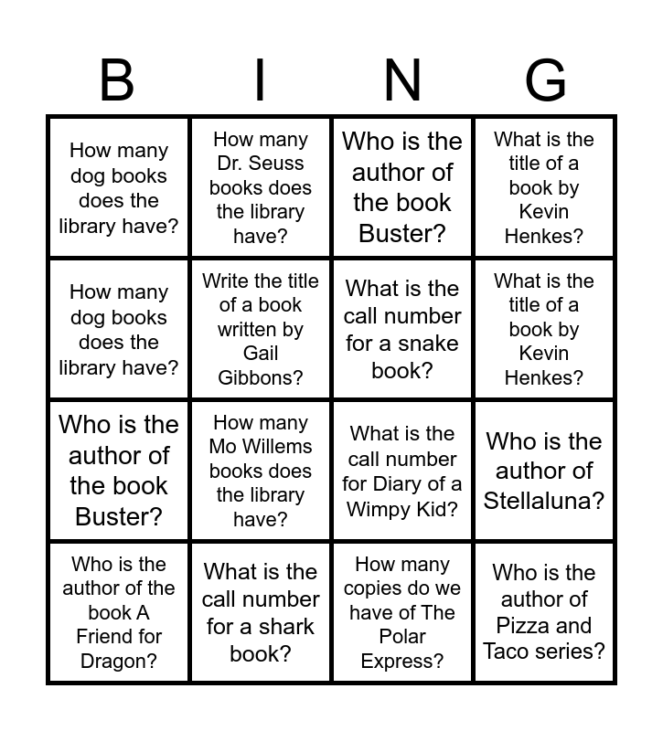 ⚠ This card has duplicate items: What is the call number for Diary of a Wimpy Kid? (2), Who is the author of Stellaluna? (2), What is the call number for A Light in the Attic? (2), Who is the author of Pizza and Taco series? (2), What is the call number for a snake book? (2), How many dog books does the library have? (2), How many copies do we have of The Polar Express? (2), How many Dr. Seuss books does the library have? (2), Who is the author of the book A Friend for Dragon? (2), What is the title of a book by Kevin Henkes? (2), Who is the author of the book Buster? (2), Write the title of a book written by Gail Gibbons? (2), How many Cinderella books does the library have? (2), What is the call number for a shark book? (2), How many Mo Willems books does the library have? (2), How many joke books does the library have? (2)