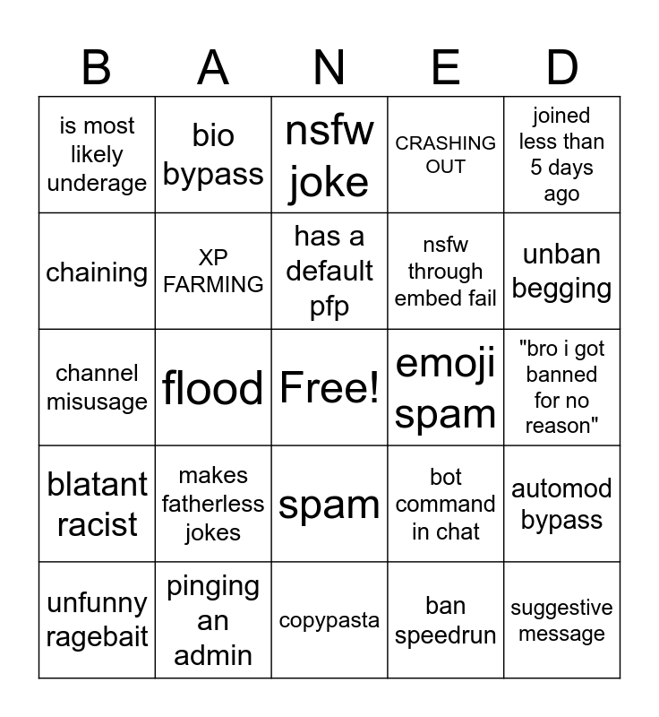 This bingo card has a free space and 24 words: makes fatherless jokes, pinging an admin, has a default pfp, unfunny ragebait, joined less than 5 days ago, is most likely underage, chaining, bio bypass, emoji spam, spam, nsfw through embed fail, channel misusage, bot command in chat, automod bypass, XP FARMING, ban speedrun, "bro i got banned for no reason", nsfw joke, unban begging, flood, suggestive message, blatant racist, CRASHING OUT and copypasta.