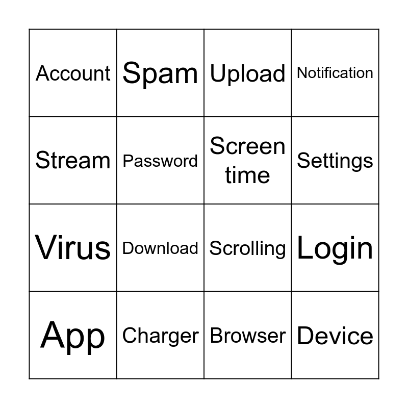 This bingo card has 17 words: App, Charger, Upload, Notification, Virus, Password, Scrolling, Settings, Stream, Download, Browser, Login, Account, Spam, Screen time, Device and Swipe.