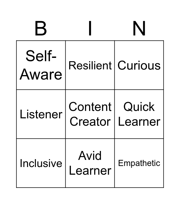 This bingo card has 1 images and 26 words: Authentic, Empathetic, Creative, Quick Learner, Curious, Resilient, Chill, Adaptable, Tech-Savvy, Multitasker, Listener, Networker, Forward-Thinker, Humorous, Communicator, Inclusive, Avid Learner, Growth Mindset, Self-Aware, Value-Driven, Critical Thinker, Vibe Checker, Meme Savvy, Digital Native, Content Creator and Trendsetter.