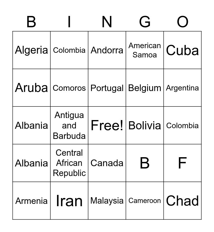 This bingo card has a free space and 91 words: United Kingdom, United States, Canada, Australia, New Zealand, France, Canada, Iraq, Egypt, Saudi Arabia, Sudan, Spain, Mexico, Colombia, Argentina, Portugal, Brazil, Germany, Austria, Switzerland, Belgium, Italy, Malaysia, Russia, Albania, Iran, Afghanistan, Singapore, Taiwan, China, Taiwan, F, Afghanistan, Albania, Algeria, American Samoa, Andorra, Angola, Antigua and Barbuda, Argentina, Armenia, Aruba, Australia, Austria, Azerbaijan, B, The Bahamas, Bahrain, Bangladesh, Barbados, Belarus, Belgium, Belize, Benin, Bermuda, Bhutan, Bolivia, Bosnia and Herzegovina, Botswana, Brazil, Brunei, Bulgaria, Burkina Faso, Burundi, C, Cabo Verde (Cape Verde), Cambodia, Cameroon, Canada, Cayman Islands, Central African Republic, Chad, Chile, China, Colombia, Comoros, Democratic Republic of the Congo, Republic of the Congo, Costa Rica, Côte d’Ivoire, Croatia, Cuba, Curaçao, Cyprus, Czech Republic, D, Denmark, Djibouti, Dominica, Dominican Republic and E.