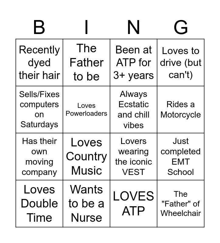 This bingo card has 16 words: Wants to be a Nurse, Just completed EMT School, Been at ATP for 3+ years, Recently dyed their hair, Has their own moving company, The Father to be, Lovers wearing the iconic VEST, LOVES ATP, Sells/Fixes computers on Saturdays, Loves Powerloaders, Loves Double Time, Loves to drive (but can't), Loves Country Music, Rides a Motorcycle, Always Ecstatic and chill vibes and The "Father" of Wheelchair.