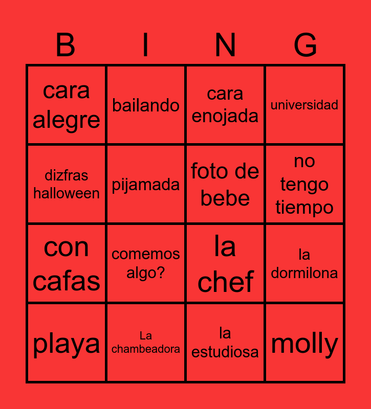 This bingo card has 16 words: La chambeadora, la dormilona, cara enojada, cara alegre, con cafas, bailando, la chef, la estudiosa, dizfras halloween, pijamada, playa, universidad, comemos algo?, no tengo tiempo, foto de bebe and molly.