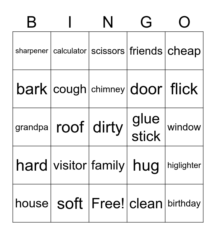 This bingo card has 25 words: hard, soft, dirty, clean, cheap, sharpener, calculator, scissors, glue stick, higlighter, bark, cough, Free!, hug, flick, house, roof, chimney, door, window, grandpa, visitor, family, friends and birthday.