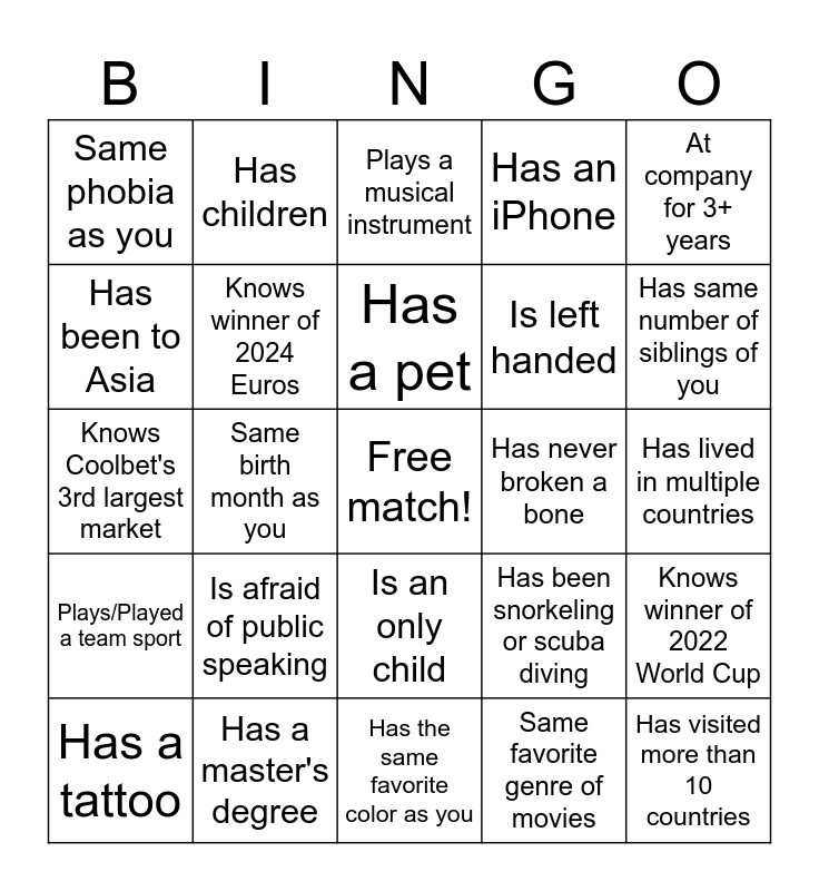 This bingo card has a free space and 24 words: Is afraid of public speaking, Has a master's degree, Has a pet, Has a tattoo, At company for 3+ years, Same phobia as you, Has been to Asia, Has children, Has never broken a bone, Is an only child, Is left handed, Knows Coolbet's 3rd largest market, Has been snorkeling or scuba diving, Knows winner of 2022 World Cup, Knows winner of 2024 Euros, Same favorite genre of movies, Has lived in multiple countries, Plays a musical instrument, Has same number of siblings of you, Same birth month as you, Has visited more than 10 countries, Plays/Played a team sport, Has an iPhone and Has the same favorite color as you.