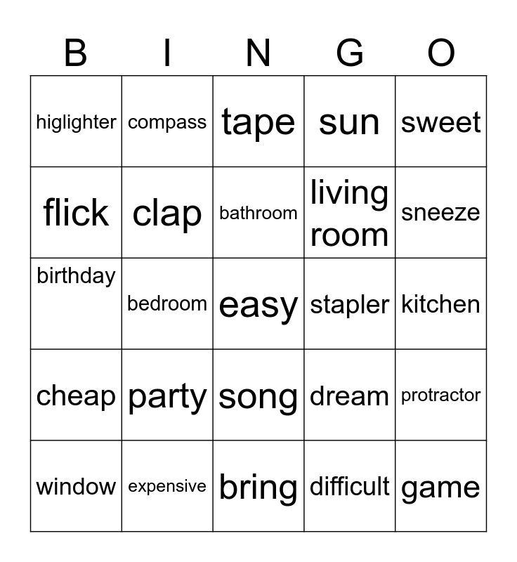 This bingo card has 25 words: cheap, expensive, easy, difficult, sweet, higlighter, compass, tape, stapler, protractor, flick, clap, bring, dream, sneeze, window, bedroom, bathroom, living room, kitchen, birthday, party, song, sun and game.