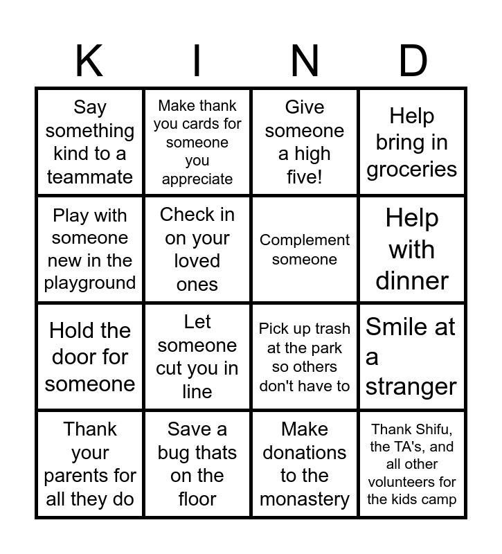 This bingo card has 20 words: Smile at a stranger, Clean up a mess that isn't mine, Give someone a high five!, Help Shifus clean up after kids camp!, Thank your parents for all they do, Play with someone new in the playground, Save a bug thats on the floor, Say something kind to a teammate, Hold the door for someone, Make thank you cards for someone you appreciate, Let someone cut you in line, Pick up trash at the park so others don't have to, Check in on your loved ones, Thank Shifu, the TA's, and all other volunteers for the kids camp, Complement someone, Help your family with the chores, Help with dinner, Help bring in groceries, Make donations to the monastery and Say "Please" and "Thank you".