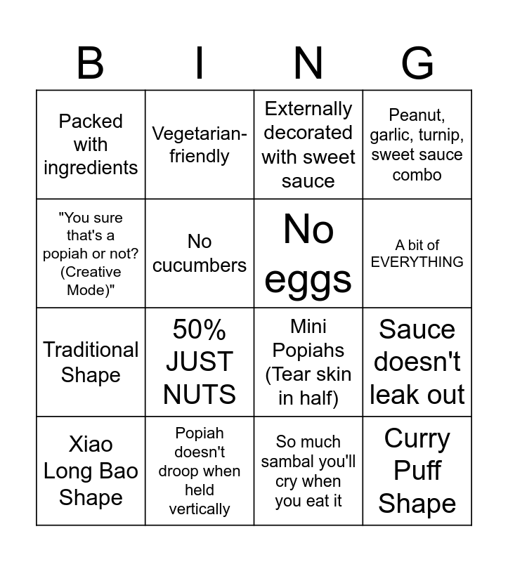 This bingo card has 16 words: Popiah doesn't droop when held vertically, Sauce doesn't leak out, Externally decorated with sweet sauce, Packed with ingredients, Traditional Shape, Vegetarian-friendly, Mini Popiahs (Tear skin in half), So much sambal you'll cry when you eat it, "You sure that's a popiah or not? (Creative Mode)", No cucumbers, Xiao Long Bao Shape, Peanut, garlic, turnip, sweet sauce combo, 50% JUST NUTS, A bit of EVERYTHING, No eggs and Curry Puff Shape.