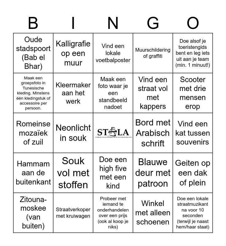 This bingo card has a free space and 24 words: Zitouna-moskee (van buiten), Souk vol met stoffen, Maak een foto waar je een standbeeld nadoet, Winkel met alleen schoenen, Doe alsof je toeristengids bent en leg iets uit aan je team (min. 1 minuut!), Oude stadspoort (Bab el Bhar), Kalligrafie op een muur, Vind een lokale voetbalposter, Bord met Arabisch schrift, Vind een kat tussen souvenirs, Romeinse mozaïek of zuil, Kleermaker aan het werk, Blauwe deur met patroon, Geiten op een dak of plein, Maak een groepsfoto in Tunesische kleding. Minstens één kledingstuk of accessoire per persoon., Straatverkoper met kruiwagen, Probeer met iemand te onderhandelen over een prijs (ook al koop je niks), Muurschildering of graffiti, Scooter met drie mensen erop, Hammam aan de buitenkant, Neonlicht in souk, Doe een high five met een kind, Vind een straat vol met kappers and Doe een lokale straatmuzikant na voor 10 seconden (terwijl je naast hem/haar staat).