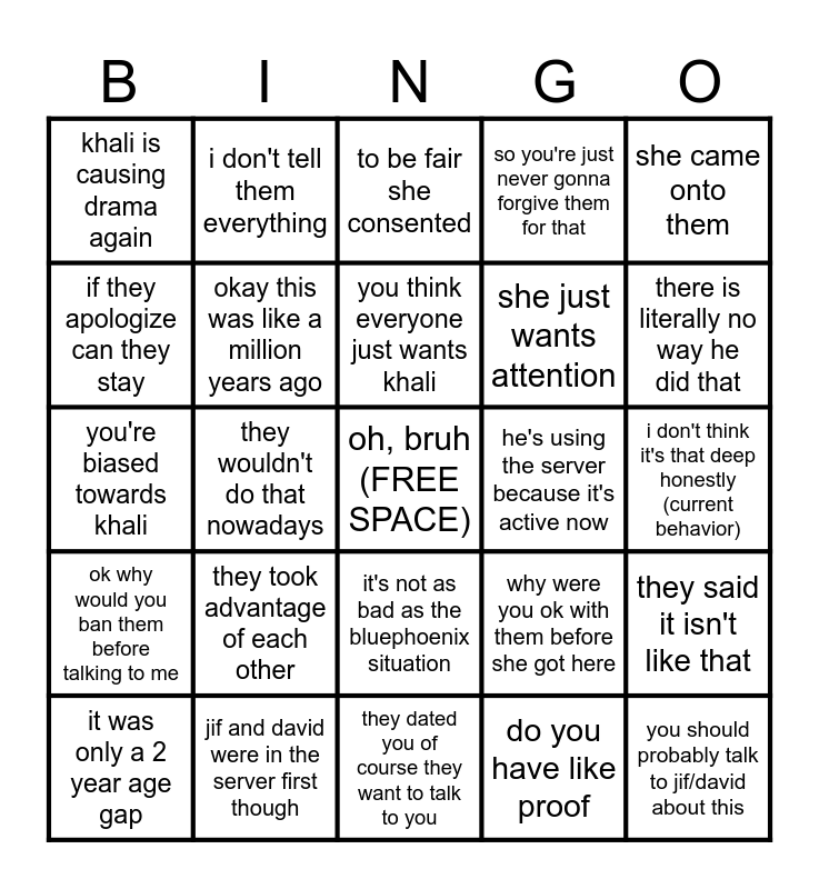 This bingo card has a free space and 29 words: it was only a 2 year age gap, okay jif is like fine, they wouldn't do that nowadays, khali shouldn't have come back, khali is causing drama again, to be fair she consented, okay this was like a million years ago, they took advantage of each other, he's using the server because it's active now, jif and david were in the server first though, i don't think it's that deep honestly (current behavior), you should probably talk to jif/david about this, they dated you of course they want to talk to you, do you have like proof, there is literally no way he did that, that isn't that weird (past behavior), it's not as bad as the bluephoenix situation, ok why would you ban them before talking to me, she came onto them, you're biased towards khali, why were you ok with them before she got here, why is she bringing this back up, she just wants attention, if they apologize can they stay, so you're just never gonna forgive them for that, i don't tell them everything, they said it isn't like that, you think everyone just wants khali and it isn't fair to just ban them.