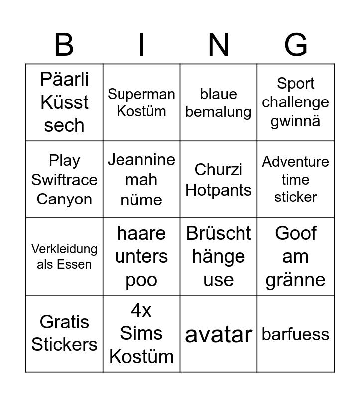 This bingo card has 16 words: 4x Sims Kostüm, Goof am gränne, blaue bemalung, Päarli Küsst sech, Verkleidung als Essen, Superman Kostüm, Brüscht hänge use, avatar, Play Swiftrace Canyon, Jeannine mah nüme, Gratis Stickers, Sport challenge gwinnä, haare unters poo, Adventure time sticker, Churzi Hotpants and barfuess.