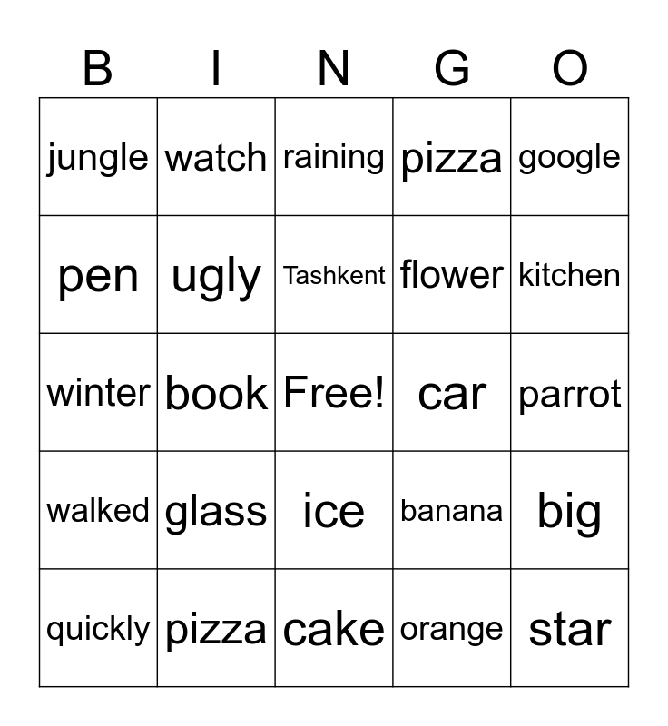 This bingo card has a free space and 24 words: glass, pizza, Tashkent, quickly, google, jungle, pen, watch, car, ice, flower, winter, banana, big, ugly, orange, parrot, raining, kitchen, book, star, walked, pizza and cake.