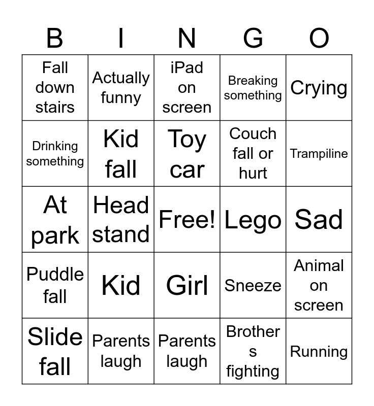 This bingo card has a free space and 24 words: Slide fall, Kid, Toy car, Brother s fighting, Crying, Fall down stairs, Actually funny, iPad on screen, Lego, Sad, At park, Kid fall, Sneeze, Animal on screen, Drinking something, Parents laugh, Parents laugh, Breaking something, Trampiline, Puddle fall, Head stand, Girl, Couch fall or hurt and Running.