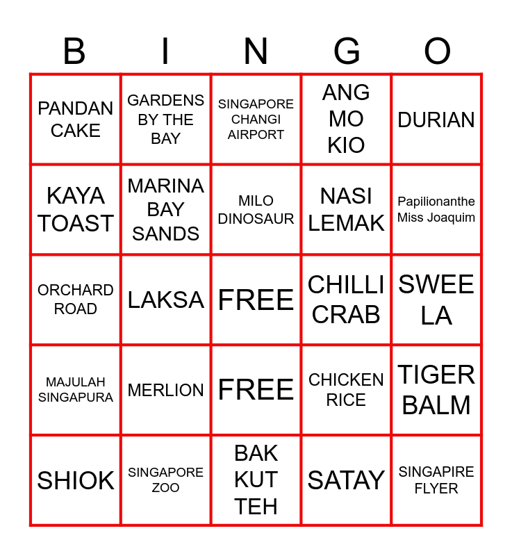 This bingo card has a free space and 24 words: MERLION, SINGAPORE ZOO, MILO DINOSAUR, SHIOK, DURIAN, PANDAN CAKE, KAYA TOAST, GARDENS BY THE BAY, CHILLI CRAB, FREE, NASI LEMAK, ORCHARD ROAD, CHICKEN RICE, TIGER BALM, MARINA BAY SANDS, SATAY, SWEE LA, SINGAPORE CHANGI AIRPORT, Papilionanthe Miss Joaquim, LAKSA, SINGAPIRE FLYER, MAJULAH SINGAPURA, ANG MO KIO and BAK KUT TEH.