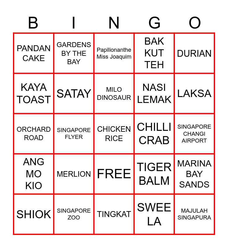 This bingo card has a free space and 24 words: MERLION, SINGAPORE ZOO, MILO DINOSAUR, SHIOK, DURIAN, PANDAN CAKE, KAYA TOAST, GARDENS BY THE BAY, CHILLI CRAB, FREE, NASI LEMAK, ORCHARD ROAD, TIGER BALM, MARINA BAY SANDS, SATAY, SWEE LA, SINGAPORE CHANGI AIRPORT, Papilionanthe Miss Joaquim, LAKSA, SINGAPORE FLYER, MAJULAH SINGAPURA, ANG MO KIO, BAK KUT TEH and TINGKAT.