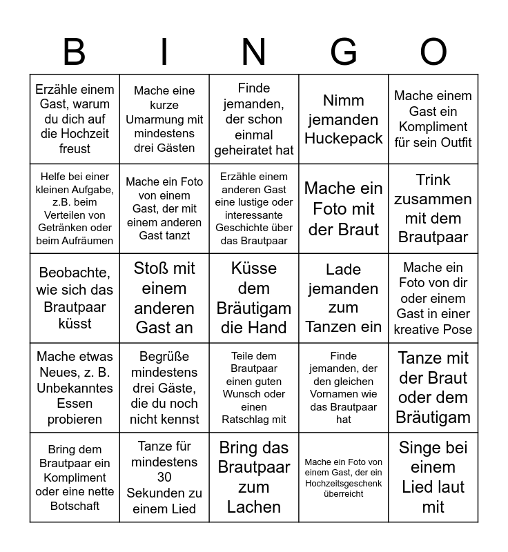 This bingo card has a free space and 24 words: Begrüße mindestens drei Gäste, die du noch nicht kennst, Tanze für mindestens 30 Sekunden zu einem Lied, Erzähle einem anderen Gast eine lustige oder interessante Geschichte über das Brautpaar, Bring dem Brautpaar ein Kompliment oder eine nette Botschaft, Mache einem Gast ein Kompliment für sein Outfit, Erzähle einem Gast, warum du dich auf die Hochzeit freust, Helfe bei einer kleinen Aufgabe, z.B. beim Verteilen von Getränken oder beim Aufräumen, Mache eine kurze Umarmung mit mindestens drei Gästen, Lade jemanden zum Tanzen ein, Teile dem Brautpaar einen guten Wunsch oder einen Ratschlag mit, Mache ein Foto mit der Braut, Beobachte, wie sich das Brautpaar küsst, Finde jemanden, der den gleichen Vornamen wie das Brautpaar hat, Tanze mit der Braut oder dem Bräutigam, Mache ein Foto von einem Gast, der mit einem anderen Gast tanzt, Mache ein Foto von einem Gast, der ein Hochzeitsgeschenk überreicht, Mache ein Foto von dir oder einem Gast in einer kreative Pose, Finde jemanden, der schon einmal geheiratet hat, Trink zusammen mit dem Brautpaar, Stoß mit einem anderen Gast an, Singe bei einem Lied laut mit, Mache etwas Neues, z. B. Unbekanntes Essen probieren, Nimm jemanden Huckepack and Bring das Brautpaar zum Lachen.