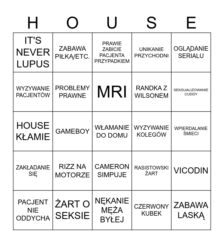 This bingo card has a free space and 24 words: RIZZ NA MOTORZE, ŻART O SEKSIE, MRI, PACJENT NIE ODDYCHA, OGLĄDANIE SERIALU, IT'S NEVER LUPUS, WYZYWANIE PACJENTÓW, ZABAWA PIŁKĄ/ETC., WYZYWANIE KOLEGÓW, CAMERON SIMPUJE, RANDKA Z WILSONEM, HOUSE KŁAMIE, RASISTOWSKI ŻART, VICODIN, PROBLEMY PRAWNE, CZERWONY KUBEK, WPIERDALANIE ŚMIECI, PRAWIE ZABICIE PACJENTA PRZYPADKIEM, SEKSUALIZOWANIE CUDDY, GAMEBOY, ZABAWA LASKĄ, ZAKŁADANIE SIĘ, UNIKANIE PRZYCHODNI and NĘKANIE MĘŻA BYŁEJ.