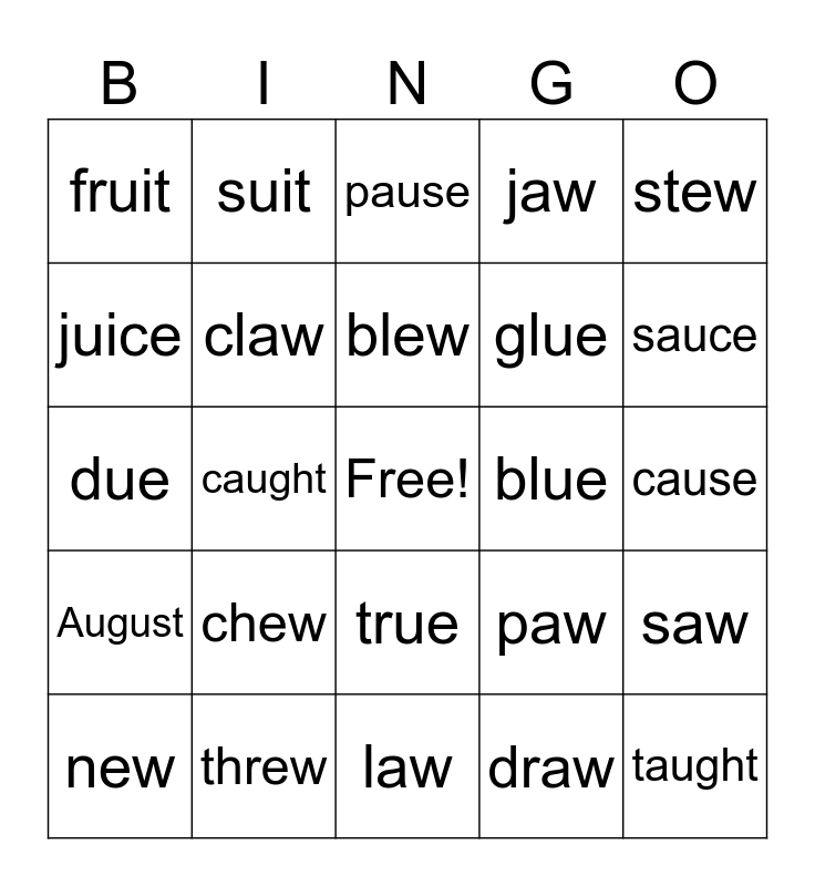 This bingo card has a free space and 24 words: chew, threw, blew, new, stew, fruit, juice, suit, blue, true, glue, due, paw, saw, claw, draw, cause, pause, sauce, caught, taught, August, jaw and law.