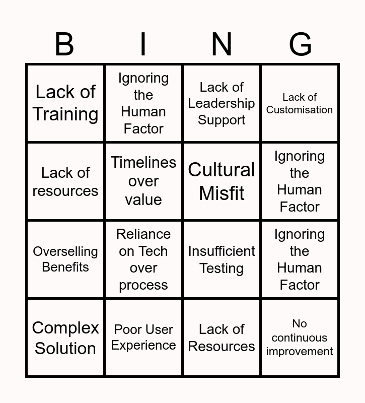 This bingo card has 24 words: Change Resistance, Poor Communication, Insufficient Testing, Timelines over value, Lack of Training, Ignoring the Human Factor, Lack of Leadership Support, Lack of Customisation, Overselling Benefits, Poor User Experience, Lack of Resources, No continuous improvement, Overlooking End User Needs, Legacy Systems, Cultural Misfit, Technical Issues, Complex Solution, Timelines over value, Ignoring the Human Factor, Lack of resources, Reliance on Tech over process, Lack of clear R&R, Ignoring the Human Factor and Adoption measurement not in place.