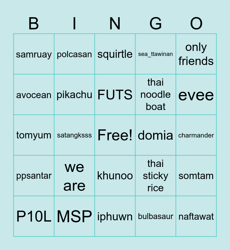 This bingo card has a free space and 24 words: we are, MSP, FUTS, P10L, only friends, samruay, avocean, polcasan, domia, khunoo, thai noodle boat, tomyum, thai sticky rice, somtam, pikachu, bulbasaur, charmander, squirtle, evee, satangksss, naftawat, ppsantar, sea_ttawinan and iphuwn.