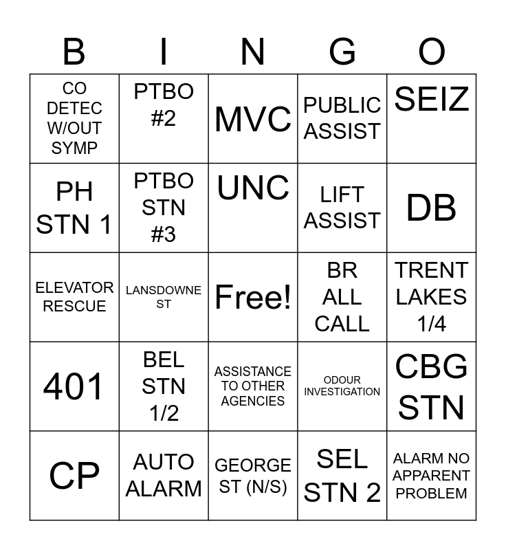 This bingo card has a free space and 24 words: BEL STN 1/2, AUTO ALARM, UNC, CP, SEIZ, CO DETEC W/OUT SYMP, PH STN 1, PTBO #2, BR ALL CALL, ASSISTANCE TO OTHER AGENCIES, LIFT ASSIST, ELEVATOR RESCUE, ODOUR INVESTIGATION, CBG STN, PTBO STN #3, SEL STN 2, TRENT LAKES 1/4, MVC, DB, LANSDOWNE ST, ALARM NO APPARENT PROBLEM, 401, PUBLIC ASSIST and GEORGE ST (N/S).