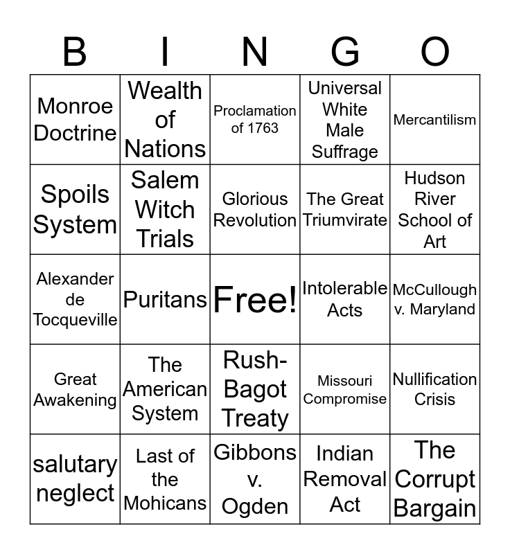 This bingo card has a free space and 33 words: House of burgesses, Fundamental Orders of Connecticut, Puritans, Middle Passage, Great Awakening, Salem Witch Trials, Mercantilism, salutary neglect, Wealth of Nations, Zenger Trial, Glorious Revolution, Proclamation of 1763, Albany Plan of Union, Stamp Act Congress, Intolerable Acts, Hudson River School of Art, Last of the Mohicans, Alexander de Tocqueville, The American System, Missouri Compromise, Rush-Bagot Treaty, Adams-Onis Treaty, Monroe Doctrine, McCullough v. Maryland, Gibbons v. Ogden, The Corrupt Bargain, Universal White Male Suffrage, The Great Triumvirate, Spoils System, Nullification Crisis, Panic of 1837, Indian Removal Act and Worcester v. Georgia.