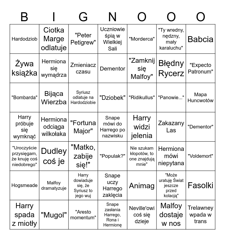 This bingo card has 60 words: Korneliusz Knot, Harry próbuje się wymknąć, "Strona 394", Bijąca Wierzba, "Fortuna Major", "Może uratuję Świat jeszcze przed kolacją", Babcia, Neville zmienia Snape'a w babcię, Hermiona się wymądrza, Fasolki, Uczniowie śpią w Wielkiej Sali, Harry dowiaduje się, że Syriusz to jego wuj, "Ty wredny, nędzny, mały karaluchu", "Matko, zabije się!", Malfoy dostaje w nos, Hardodziob, Błędny Rycerz, "Morderca", "Jak mi idzie?", Żywa książka, "Expecto Patronum", "Peter Petigrew", Mapa Huncwotów, "Panowie...", Mapa drwi ze Snape'a, "Populak?", "Uroczyście przysięgam, że knuję coś niedobrego", "Został po nim tylko palec", Zmieniacz czasu, Hermiona mówi niepytana, Hermiona pojawia się znikąd, Malfoy dramatyzuje, Neville'owi coś się dzieje, Trelawney wpada w trans, Ciotka Marge odlatuje, Harry widzi jelenia, Snape uczy Harrego zaklęcia, "Zamknij się Malfoy", Nie szukam kłopotów, to one znajdują mnie", Dementor, Animag, Syriusz odlatuje na Hardodziobie, "Bombarda", "Gruba Dama zniknęła", "Ridikullus", "Dementor", Harry spada z miotły, "Aresto momentum", Snape zasłania Harrego, Rona i Hermionę, "Dziobek", Hermiona odciąga wilkołaka, Lupin opowiada Harremu o rodzicach, Hogsmeade, Zakazany Las, Dudley coś je, "Voldemort", "Mugol", Parszywek, Snape mówi do Harrego po nazwisku and Oliwia zasypia.