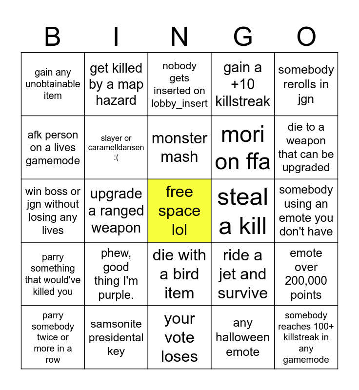 This bingo card has a free space and 89 words: high roller, win elim, die with a bird item, merged smile, long-lasting friendship, die to a pr item, first trumpet da capo, kill a +10 killstreak, xd, magic or furry tag, last person standing on either boss or jgn, win as jgn, bird up, emote over 200,000 points, somebody using an emote you don't have, two or more kills with one attack, monster mash, die to a free avatar, teamers, somebody without a display name, win gun game, jgn or boss loses the map vote, toxic person, your vote loses, lose a boss, win boss or jgn without losing any lives, samsonite presidental key, die to ultra instinct with small pebble, die to a damage requirement item, die to an ultra-instinct synergy, tsar bobm, gain a +10 killstreak, upgrade a ranged weapon, upgrade a melee weapon, gain any unobtainable item, watch somebody ragequit, nobody gets inserted on lobby_insert, afk person on a lives gamemode, die to an upgraded weapon, die to a weapon that can be upgraded, parry somebody twice or more in a row, parry something that would've killed you, die to or kill somebody with bottle, roll frog on a leash, sit inside of somebody else's car that doesn't work, ride a jet and survive, steal a kill, kill somebody with a counter/parry, get your kill stolen, one tap somebody, get killed by a map hazard, die to any explosive, have at least 3 different effects on you at once, die from either poison, bleeding or fire, die to a weapon that isn't in any kit, die to an item in a legendary kit, backshots, jailbird or nut on zs, kill a micheal p, reflect/parry a death note, find another xbox user, somebody gives up on jgn or elim, get use out of a placeable misc, miss 3 shots in a row, kill somebody without any misses, get an fnf song with micheal p first try, block hitman with a projectile, accidentally kill yourself with a ranged item, get at least 2 kills with full attack mode, successfully activate a damage requirement item, phew, good thing I'm purple., somebody reaches 100+ killstreak in any gamemode, a hacker or exploiter, avatar based off of something, mori on ffa, slayer or caramelldansen :(, any halloween emote, somebody without a display name, go at least one minute without taking any damage, any mention of something that got removed in chat, jgn accidentally falls off the map, somebody rerolls in jgn, nobody rerolls in uncertified, roll any oneshot combo potential, watch somebody use loggus, get use out of a placeable, borrow a borrow, borrow a fortnite card, borrow loadsamoney and the tag that correlates with yamato i forget what it's called.