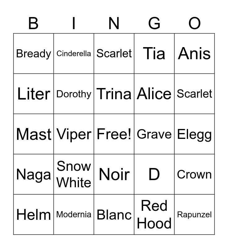 This bingo card has a free space and 28 words: Crown, Rapi, Alice, Red Hood, Liter, Scarlet, Cinderella, Naga, Grave, Helm, Mast, Tia, Modernia, Blanc, Scarlet, Quency, Snow White, Dorothy, Trina, Noir, Bready, Privaty, Rapunzel, Viper, Elegg, D, Anis and Neon.