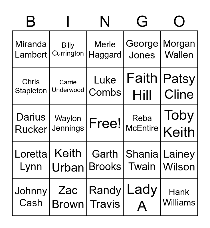This bingo card has a free space and 39 words: George Strait, Dolly Parton, Willie Nelson, Carrie Underwood, Johnny Cash, Garth Brooks, Luke Combs, Taylor Swift, Morgan Wallen, Loretta Lynn, Waylon Jennings, George Jones, Hank Williams, Toby Keith, Reba McEntire, Keith Urban, Luke Bryan, Miranda Lambert, Rascal Flatts, Shania Twain, Chris Stapleton, Randy Travis, Faith Hill, Patsy Cline, Zach Bryan, Kane Brown, Jason Aldean, Blake Shelton, Eric Church, Billy Currington, Brad Paisley, Kenny Chesney, Merle Haggard, Zac Brown, Lady A, Chris Young, Lainey Wilson, Darius Rucker and Conway Twitty.