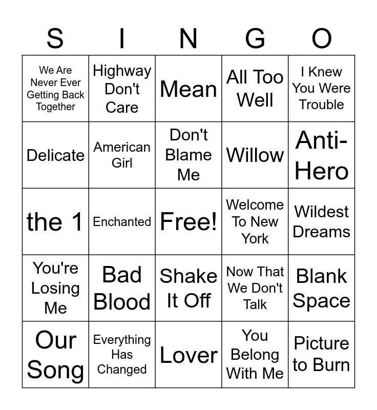 This bingo card has a free space and 43 words: Tim McGraw, Picture to Burn, Should've Said No, Our Song, Love Story, You Belong With Me, Mean, Red, I Knew You Were Trouble, Everything Has Changed, All Too Well, Welcome To New York, Shake It Off, Bad Blood, Look What You Made Me Do, Lover, Me!, the 1, August, Anti-Hero, Highway Don't Care, Fifteen, 22, We Are Never Ever Getting Back Together, Half of My Heart, Wildest Dreams, Cruel Summer, Is It Over Now?, Now That We Don't Talk, You're Losing Me, Cardigan, Blank Space, This Love, Enchanted, Back to December, Mine, I Can See You, Don't Blame Me, Delicate, Willow, Exile, American Girl and Drops of Jupiter.