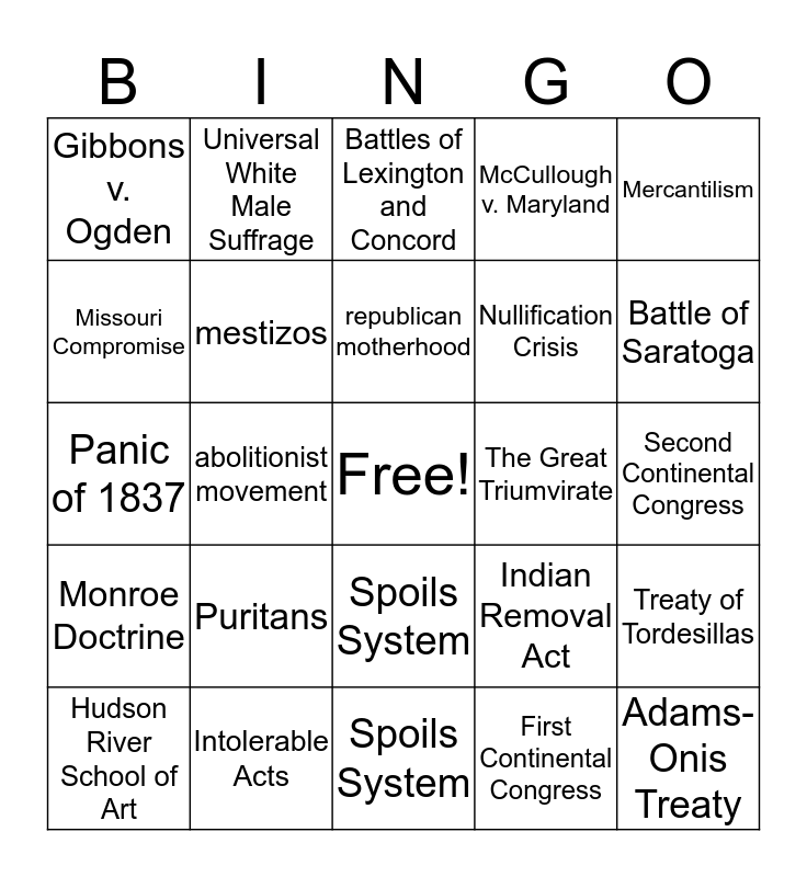 This bingo card has a free space and 24 words: Puritans, Intolerable Acts, republican motherhood, Hudson River School of Art, Mercantilism, Gibbons v. Ogden, Missouri Compromise, Universal White Male Suffrage, The Great Triumvirate, Spoils System, Nullification Crisis, Panic of 1837, Indian Removal Act, Treaty of Tordesillas, mestizos, First Continental Congress, Second Continental Congress, Battles of Lexington and Concord, Battle of Saratoga, abolitionist movement, Adams-Onis Treaty, Monroe Doctrine, McCullough v. Maryland and Spoils System.