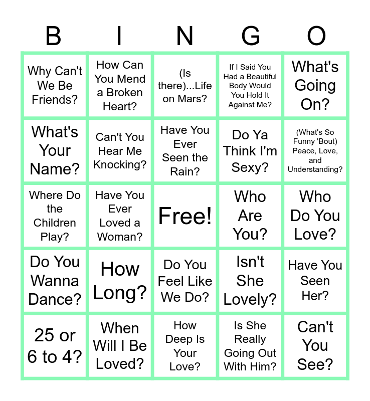 This bingo card has a free space and 24 words: How Long?, When Will I Be Loved?, Have You Ever Seen the Rain?, 25 or 6 to 4?, What's Going On?, Why Can't We Be Friends?, What's Your Name?, How Can You Mend a Broken Heart?, Who Are You?, Do You Feel Like We Do?, Do Ya Think I'm Sexy?, Where Do the Children Play?, Isn't She Lovely?, Have You Seen Her?, Can't You Hear Me Knocking?, Is She Really Going Out With Him?, Who Do You Love?, (Is there)...Life on Mars?, (What's So Funny 'Bout) Peace, Love, and Understanding?, Have You Ever Loved a Woman?, Can't You See?, Do You Wanna Dance?, If I Said You Had a Beautiful Body Would You Hold It Against Me? and How Deep Is Your Love?.
