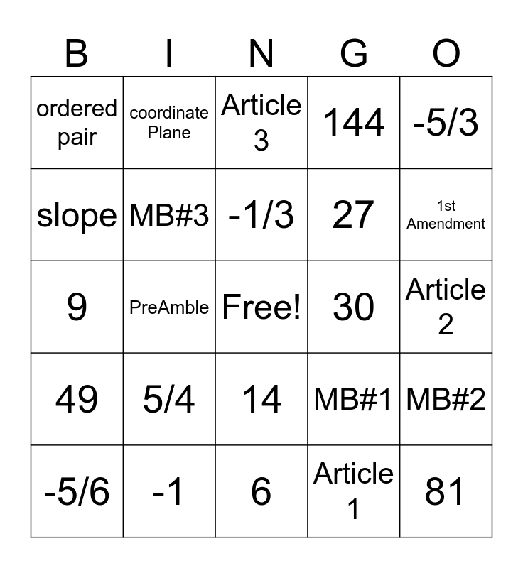 This bingo card has a free space and 24 words: 5/4, -1, -1/3, -5/6, -5/3, ordered pair, slope, coordinate Plane, 30, 14, 27, 9, MB#1, MB#2, MB#3, Article 1, Article 2, Article 3, 1st Amendment, PreAmble, 81, 49, 144 and 6.