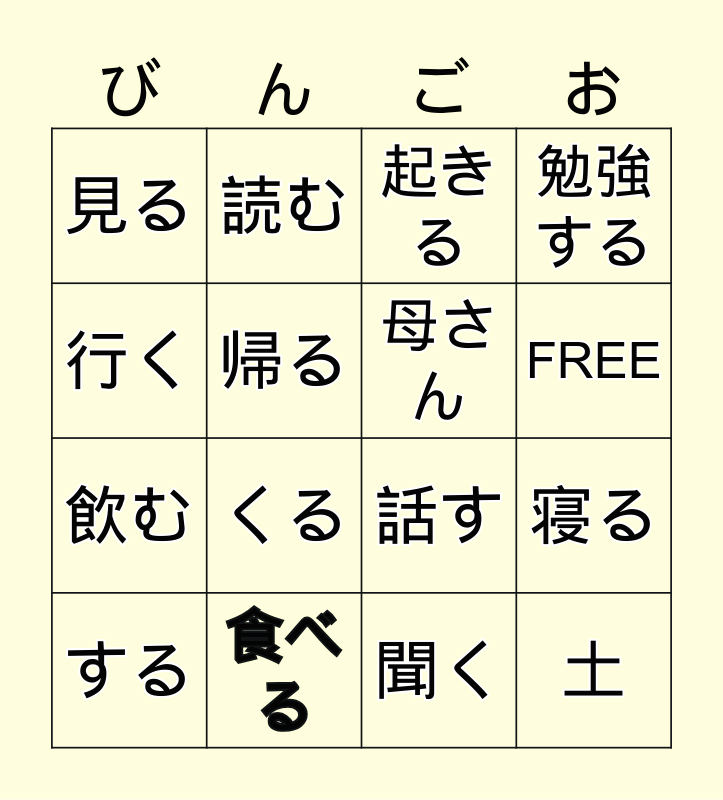This bingo card has 16 words: 食べる, 寝る, 起きる, 見る, 飲む, 読む, 話す, 聞く, 行く, 帰る, する, 勉強する, くる, FREE, 母さん and 土.