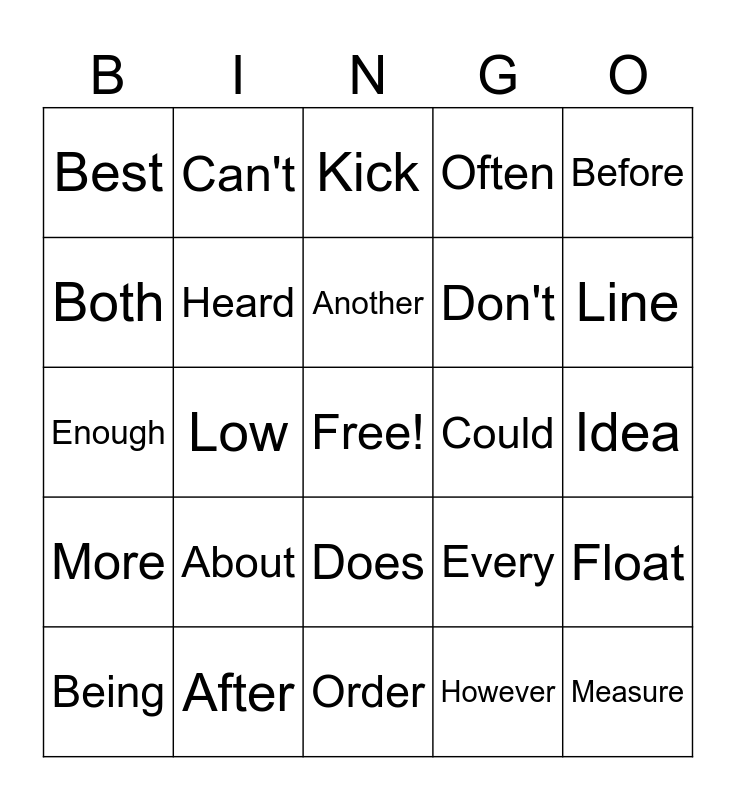 This bingo card has a free space and 24 words: About, After, Another, Being, Before, Best, Both, Can't, Could, Does, Don't, Enough, Every, Float, Heard, However, Idea, Kick, Line, Low, Measure, More, Often and Order.