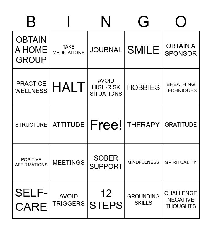 This bingo card has a free space and 24 words: MEETINGS, AVOID TRIGGERS, AVOID HIGH-RISK SITUATIONS, SELF-CARE, OBTAIN A SPONSOR, OBTAIN A HOME GROUP, PRACTICE WELLNESS, TAKE MEDICATIONS, THERAPY, SOBER SUPPORT, HOBBIES, STRUCTURE, MINDFULNESS, SPIRITUALITY, HALT, GROUNDING SKILLS, GRATITUDE, JOURNAL, BREATHING TECHNIQUES, ATTITUDE, CHALLENGE NEGATIVE THOUGHTS, POSITIVE AFFIRMATIONS, SMILE and 12 STEPS.