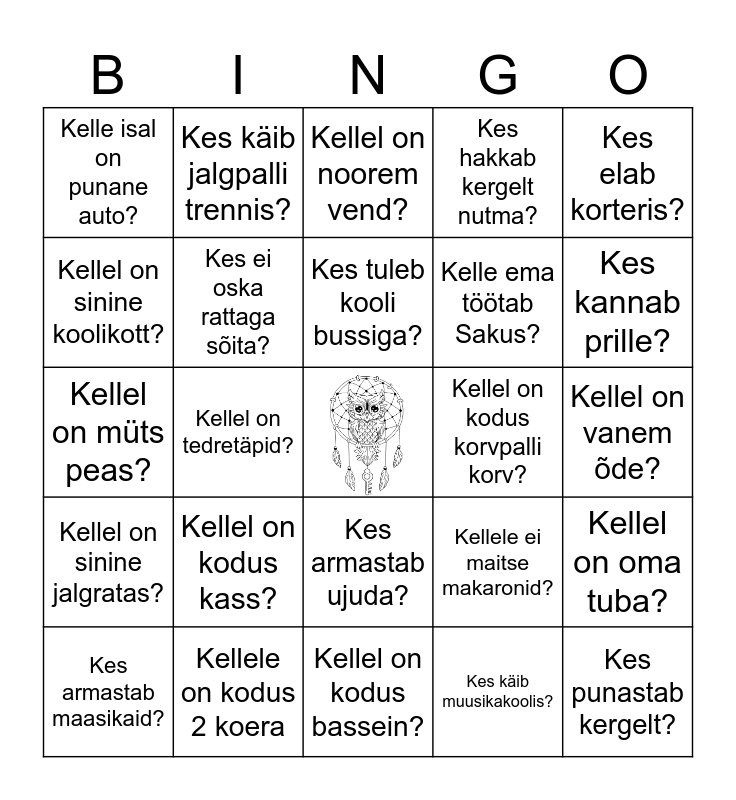 This bingo card has a free space and 24 words: Kellel on kodus kass?, Kellele on kodus 2 koera, Kes tuleb kooli bussiga?, Kes armastab maasikaid?, Kes elab korteris?, Kelle isal on punane auto?, Kellel on sinine koolikott?, Kes käib jalgpalli trennis?, Kellel on kodus korvpalli korv?, Kes armastab ujuda?, Kelle ema töötab Sakus?, Kellel on müts peas?, Kellele ei maitse makaronid?, Kellel on oma tuba?, Kes ei oska rattaga sõita?, Kes käib muusikakoolis?, Kellel on vanem õde?, Kellel on noorem vend?, Kes kannab prille?, Kellel on tedretäpid?, Kes punastab kergelt?, Kellel on sinine jalgratas?, Kes hakkab kergelt nutma? and Kellel on kodus bassein?.
