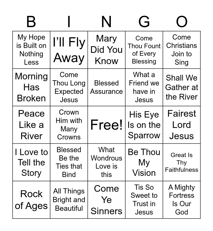This bingo card has a free space and 49 words: Amazing Grace, A Mighty Fortress Is Our God, Love Divine All Love Excelling, Come Ye Sinners, Blessed Be the Ties that Bind, Down to the River to Pray, I’ll Fly Away, Let There Be Peace On Earth, Morning Has Broken, Holy Holy Holy, Come Thou Long Expected Jesus, Come Thou Fount of Every Blessing, Great Is Thy Faithfulness, Be Thou My Vision, They Will Know We Are Christians By Our Love, It Is Well With My Soul, Blessed Assurance, His Eye Is on the Sparrow, Joyful Joyful We Adore Thee, Come Christians Join to Sing, Crown Him with Many Crowns, Tis So Sweet to Trust in Jesus, My Hope is Built on Nothing Less, What a Friend we have in Jesus, Leaning on the Everlasting Arms, Shall We Gather at the River, Rock of Ages, All Hail the Power of Jesus’ Name, What Wondrous Love is this, I Love to Tell the Story, O God Our Help In Ages Past, The Church’s One Foundation, When I Survey the Wondrous Cross, Now Thank We All Our God, All Things Bright and Beautiful, Lift High the Cross, Oh For a Thousand Tongues to Sing, 10,000 Reasons (Bless the Lord), Fairest Lord Jesus, This Is My Father's World, My Jesus, Graves Into Gardens, I Thank God, The B-I-B-L-E, Peace Like a River, Mary Did You Know, This Little Light of Mine, Go Tell It On the Mountain and If I Had A Hammer.