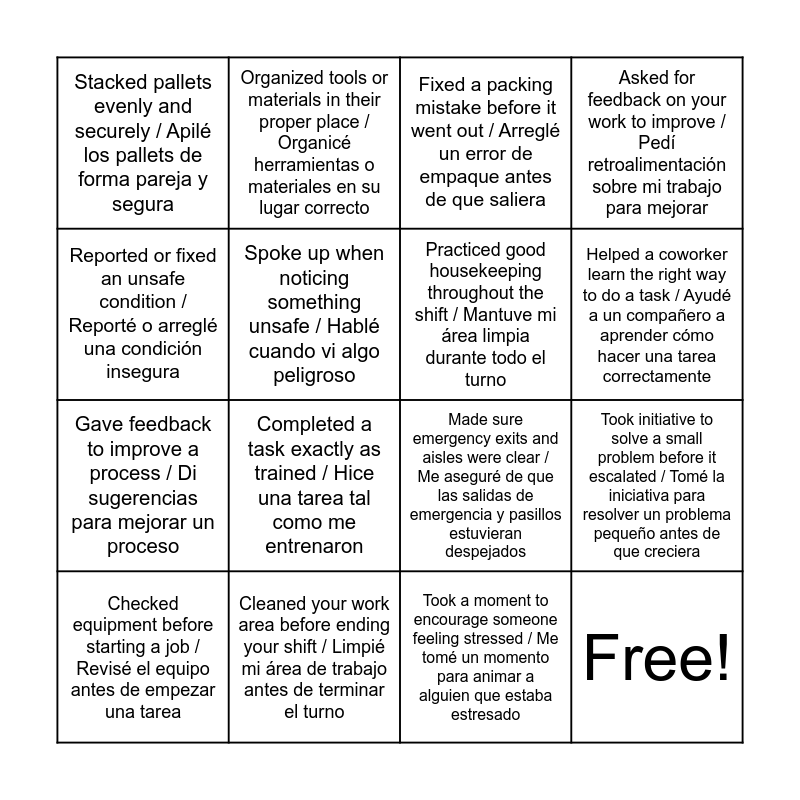 This bingo card has 23 words: Free!, Asked a coworker for help when unsure of something / Le pedí ayuda a un compañero cuando no estaba seguro de algo, Helped a coworker learn the right way to do a task / Ayudé a un compañero a aprender cómo hacer una tarea correctamente, Reminded someone about safe lifting techniques / Le recordé a alguien cómo levantar cosas de forma segura, Reported or fixed an unsafe condition / Reporté o arreglé una condición insegura, Stacked pallets evenly and securely / Apilé los pallets de forma pareja y segura, Spoke up when noticing something unsafe / Hablé cuando vi algo peligroso, Organized tools or materials in their proper place / Organicé herramientas o materiales en su lugar correcto, Checked equipment before starting a job / Revisé el equipo antes de empezar una tarea, Asked questions to clarify instructions / Hice preguntas para entender mejor las instrucciones, Completed a task exactly as trained / Hice una tarea tal como me entrenaron, Gave feedback to improve a process / Di sugerencias para mejorar un proceso, Took responsibility for correcting a mistake / Me hice responsable de corregir un error, Followed safe lifting procedures when moving heavy items / Usé las técnicas correctas para levantar cosas pesadas, Cleaned your work area before ending your shift / Limpié mi área de trabajo antes de terminar el turno, Reminded someone to wear their PPE / Le recordé a alguien que se pusiera su equipo de protección, Fixed a packing mistake before it went out / Arreglé un error de empaque antes de que saliera, Made sure emergency exits and aisles were clear / Me aseguré de que las salidas de emergencia y pasillos estuvieran despejados, Practiced good housekeeping throughout the shift / Mantuve mi área limpia durante todo el turno, Took initiative to solve a small problem before it escalated / Tomé la iniciativa para resolver un problema pequeño antes de que creciera, Asked for feedback on your work to improve / Pedí retroalimentación sobre mi trabajo para mejorar, Took a moment to encourage someone feeling stressed / Me tomé un momento para animar a alguien que estaba estresado and Took time to organize your workspace for better flow / Organicé mi área de trabajo para que fuera más eficiente.
