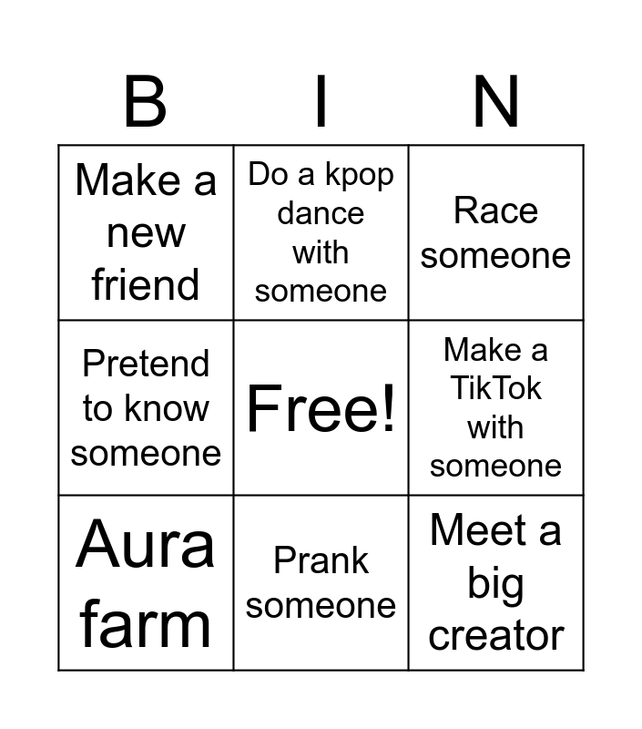 This bingo card has a free space and 8 words: Make a TikTok with someone, Race someone, Do a kpop dance with someone, Aura farm, Make a new friend, Meet a big creator, Pretend to know someone and Prank someone.