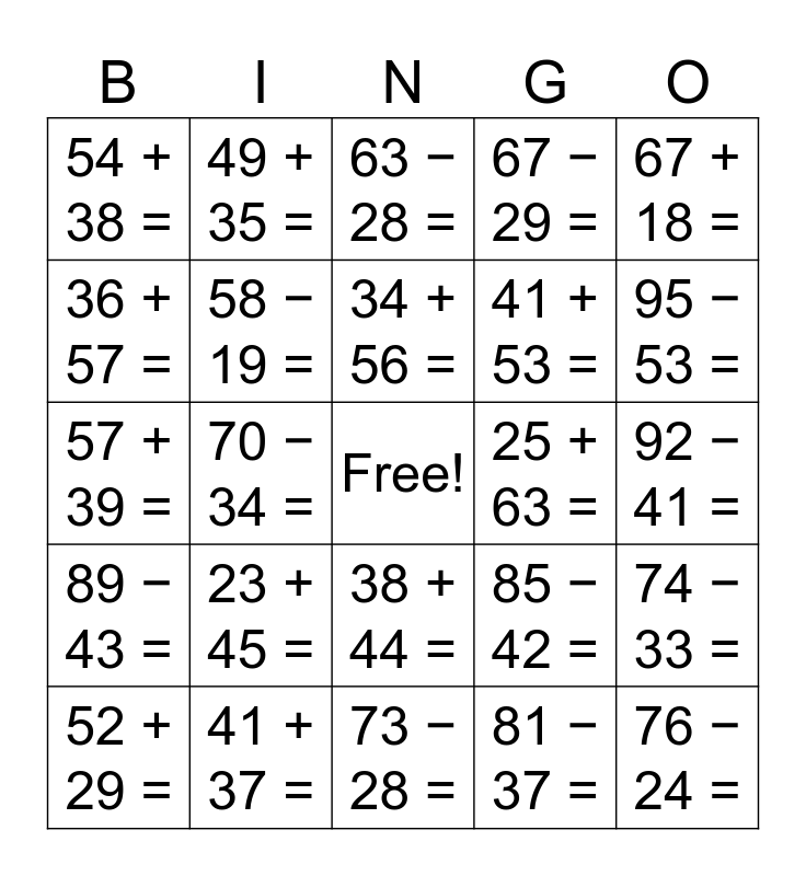 This bingo card has a free space and 24 words: 23 + 45 =, 41 + 37 =, 34 + 56 =, 52 + 29 =, 67 + 18 =, 54 + 38 =, 36 + 57 =, 49 + 35 =, 25 + 63 =, 38 + 44 =, 41 + 53 =, 57 + 39 =, 85 − 42 =, 74 − 33 =, 58 − 19 =, 81 − 37 =, 92 − 41 =, 63 − 28 =, 95 − 53 =, 70 − 34 =, 76 − 24 =, 89 − 43 =, 67 − 29 = and 73 − 28 =.
