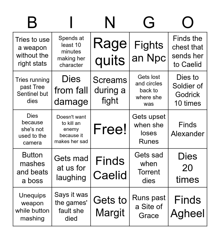 This bingo card has a free space and 24 words: Gets mad at us for laughing, Says it was the games' fault she died, Screams during a fight, Unequips weapon while button mashing, Finds the chest that sends her to Caelid, Tries to use a weapon without the right stats, Tries running past Tree Sentinel but dies, Spends at least 10 minutes making her character, Gets upset when she loses Runes, Finds Caelid, Gets lost and circles back to where she was, Dies because she's not used to the camera, Gets sad when Torrent dies, Dies 20 times, Dies from fall damage, Runs past a Site of Grace, Finds Alexander, Rage quits, Dies to Soldier of Godrick 10 times, Doesn't want to kill an enemy because it makes her sad, Finds Agheel, Button mashes and beats a boss, Fights an Npc and Gets to Margit.